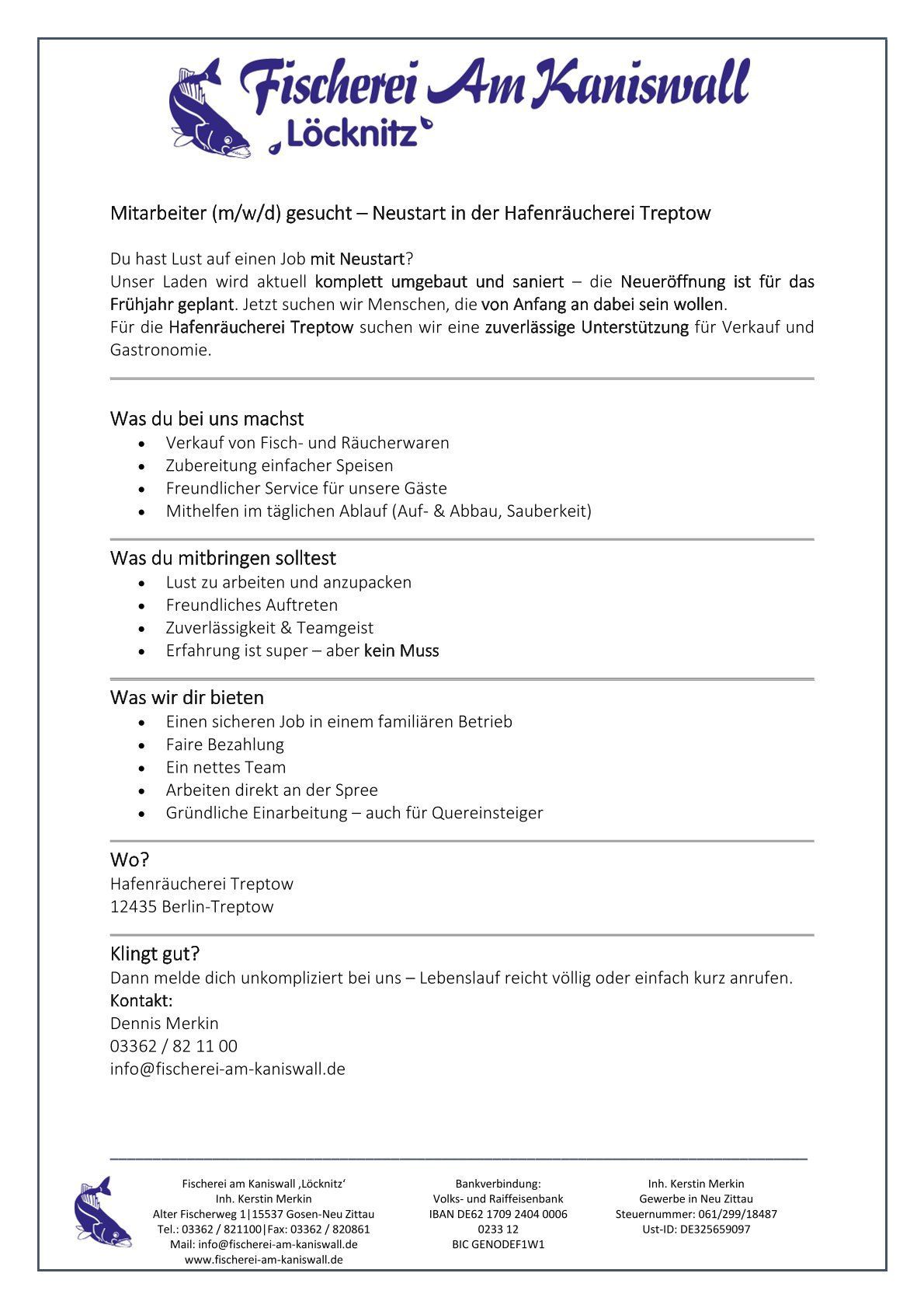 Für die Hafenräucherei Treptow suchen wir eine zuverlässige Unterstützung für